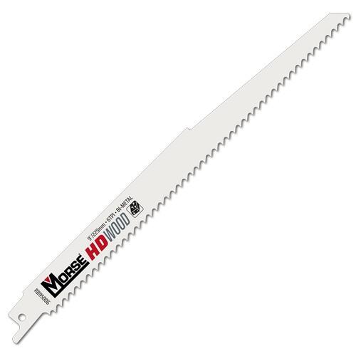 Morse RB95006T50 (402033), 9" x 6 tooth, bimetal reciprocating saw blade is specifically designed for cutting all types of wood, nail-embedded wood and wood composites. Tapered blade body eases the ability to plunge cut. Reinforced tooth profile resists premature tooth strippage in nail-embedded wood applications. Heavy duty, .050" blade thickness provides rigidity under heavier feed pressure. Fifty (50) blades per pack.