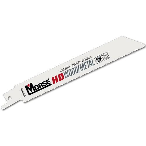 Morse RB61014T05 (402002), 6" x 10/14 variable tooth, bimetal reciprocating saw blade is designed for cutting a variety of materials, from wood to metal, with various thickness, from 1/4" to 1/2". Straight blade body reduces blade deflection, under feed pressure. Standard .035" blade thickness provides flexibility to reach tight spaces. Five (5) blades per pack.