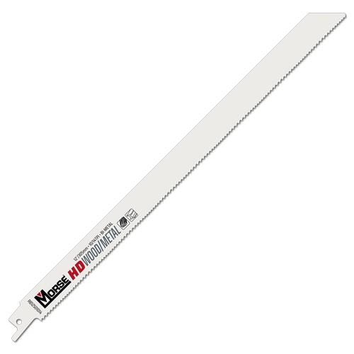 Morse RB12501014T05 (402095), 12" x 10/14 variable tooth, bimetal reciprocating saw blade is designed for cutting a variety of materials, from wood to metal, with various thickness, from 1/4" to 1/2". Straight blade body reduces blade deflection, under feed pressure. Heavy duty, .050" blade thickness provides rigidity under heavier feed pressure. Five (5) blades per pack.