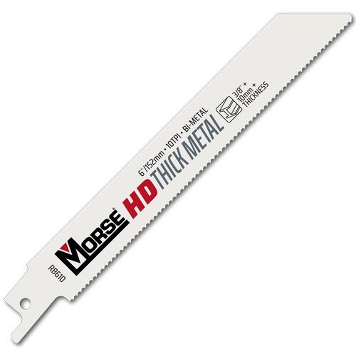 Morse RB610T05 (400398), 6" x 10TPI, bimetal reciprocating saw blade is designed for cutting metal, 3/8" and thicker. Straight blade body reduces blade deflection, under feed pressure. Standard .035" blade thickness provides flexibility to reach tight spaces. Five (5) blades per pack.