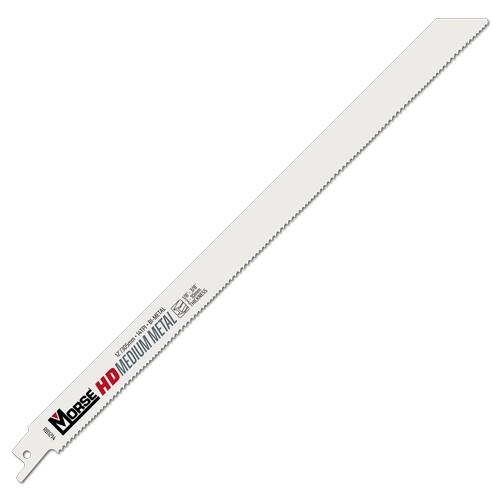 Morse RB1214T05 (400138), 12" x 14TPI, bimetal reciprocating saw blade is designed for cutting metal, from 1/8", up to 3/8", thickness. Straight blade body reduces blade deflection, under feed pressure. Standard .035" blade thickness provides flexibility to reach tight spaces. Five (5) blades per pack.