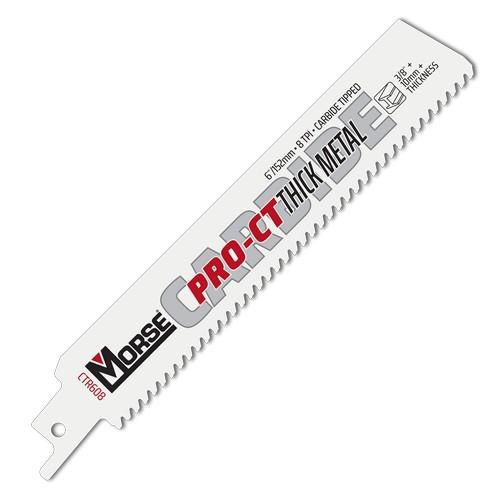 Morse CTR608MC1 (405218), 6" x 8TPI, carbide tipped reciprocating saw blade is designed for metal and hard, abrasive cutting applications that traditional blades can't cut. Precision ground tooth profile optimizes performance in metal applications of 3/8" and thicker, as well as abrasive applications between 3/16" and 1/2". Heavy duty blade body provides rigidity under heavier feed pressure. One (1) blades per pack.