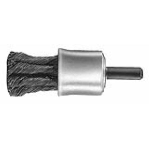 A Knotted End Brush is better equipped than a Crimped End Brush for heavy burr and scale removal, cleaning rust, castings, paint build up around studs and bolts. The twisted strands of wire form a sturdy surface to work against the material being removed. This Knotted End Brush has a face diameter of 3/4 inch to get into tight areas and is made of .014 carbon steel wire.