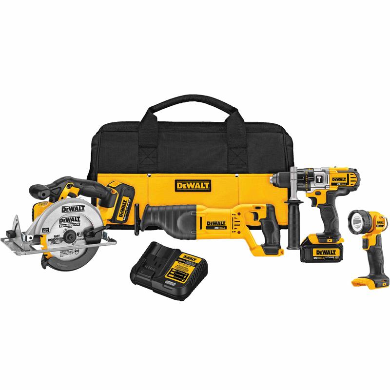 The DCK491L2 20V MAX* Lithium Ion 4-Tool Combo Kit includes a hammerdrill with a 3-speed transmission, reciprocating saw with keyless blade clamp, circular saw with 6-1/2" carbide blade, and a 20V MAX LED work light.
