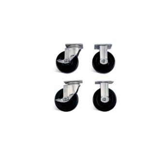 The Model 660 set of four 6 in casters with brakes fits all Knaack jobsite storage models. The 2 in Phenolic HD wheels support 3,280 lbs per set. The set includes two rigid and two swivel wheels.