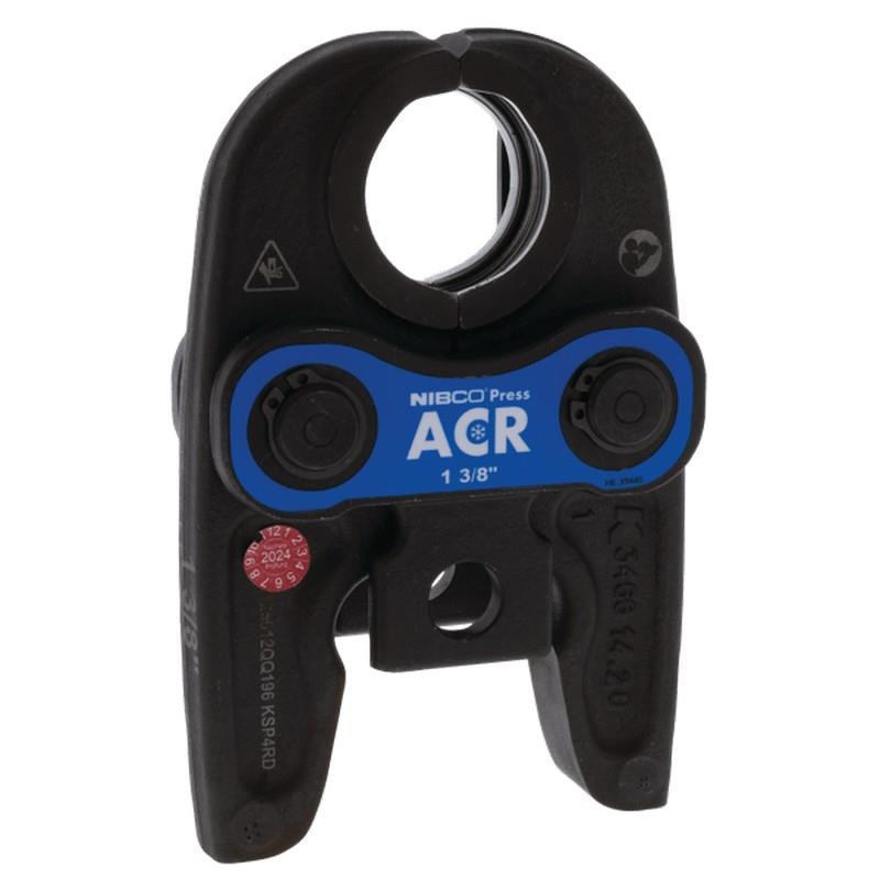 The NIBCO PressACR 1 3/8-inch OD standard pressing jaw is intended for use with the PC-280 press tool. The pressing jaw is installed in the appropriate pressing tool. When the trigger on the pressing tool is depressed a crimp is made, and the jaws must close completely to ensure a leak-free connection..